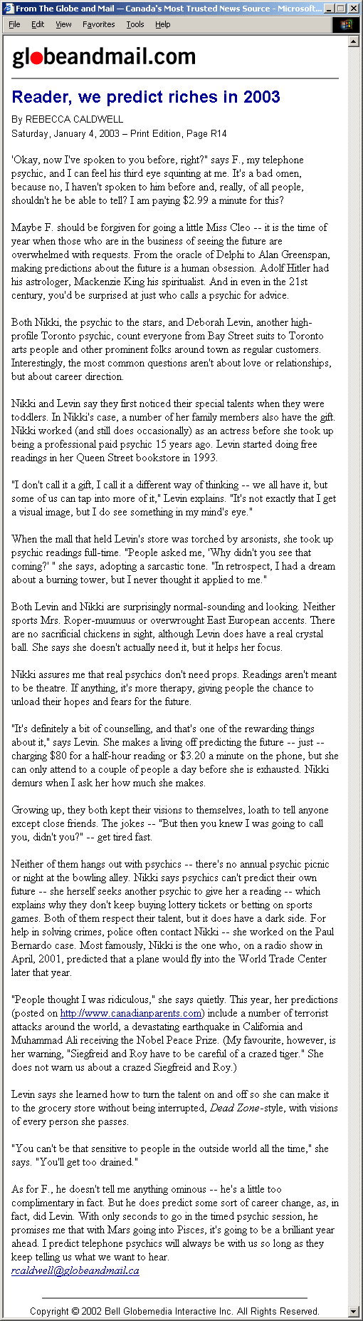 - Interview in the Globe and Mail (PDF version, Image, HTML version)